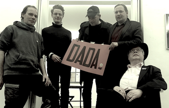 v.l.n.r. Wolfgang Szallies (Galerie am Markt 21 in Weimar), Konstantin Bayer (Galerie Eigenheim Berlin) und dem Ensemble der Dadamenta mit Daniel Hoffmann, Axel Görmarsson Görmar und Michael von Hintzenstern am 29. März 2018 zur Jubiläumsveranstaltung 100 Jahre Club Dada in der Galerie Eigenheim in der Linienstraße, Ecke Oranienburger in Berlin Mitte.